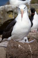 Een albatros op de Falklandeilanden zit op zijn nest en bewaakt zijn kuiken.