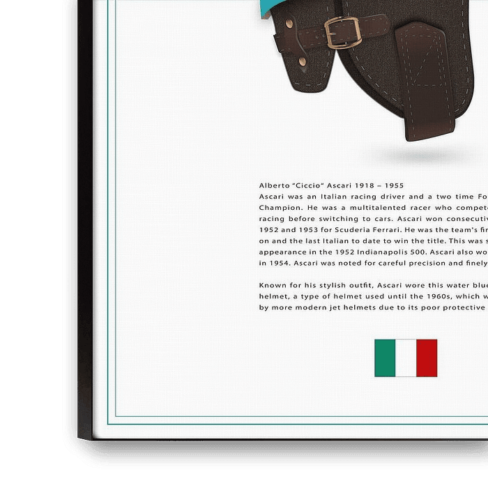 Afdrukken met de persoonlijke valhelmen van beroemde coureurs uit de jaren 1950 en 1960.