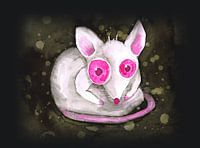 Een aquarel tekening van een witte albino rat met roze-rode ogen. De donkere achtergrond is grunge stijl met vlekken en spetters.