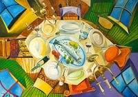 Onderwerpen en thema's van mijn werk zijn altijd "dicht bij huis" herkenbaar voor iedereen, het zijn verhalen/interpretaties op de werkelijkheid. Gedekte tafels, stadsgezichten zijn zoals kubistische kunst multi-perspectivisch en elke zijde is op een andere manier interessant.