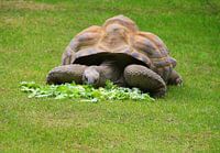 De Aldabra Schildpad is één van de grootste reuzenschildpadden ter wereld. Deze vriendelijke reus eet vooral plantaardig materiaal. Eieren legt de schildpad in een ondiepe kuil die ze daarna dichtmaakt. De jongen komen boven de grond aan het begin van de regentijd, wanneer er voldoende voedsel is. De schildpad heeft geen tanden, maar de bek is een soort snavel. Met de harde rand kan hij planten afsnijden. Per dag is hij ongeveer vier uur actief, dan zoekt hij naar voedsel. De rest van de dag rust hij in de schaduw. Omdat schildpadden koudbloedige dieren zijn, is de buitentemperatuur belangrijk voor hun activiteit. Tussen de 25 °C en 30°C zijn ze het actiefst bron wikipedia