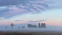 Een mistige zonsopkomst in de Alde Feanen. Dit is het landschap dat je ziet als je op de Saiterpetten vaart en richting het Holstmeer kijkt.