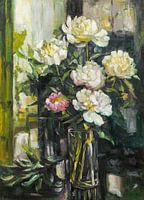 Stilleven met een bos bloemen, een boeket in een vaas op een tafel. Bouquet met wit en rood.