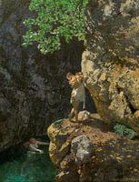 Een vrouwelijk figuur, een meermin zwemt als figuur uit een mythe tussen de rotsen terwijl een mannelijk figuur, beiden naakt of zo goed als, op zijn muziekinstrument, een dwarsfluit fluit.