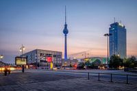 En zich top Alexanderplatz in Berlijn in de schemering van de avond met de Fernsehturm verlicht met blauwe sfeerverlichting