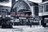Zwart-wit foto met rode letters van het station Alexanderplatz in Berlijn
