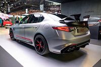 Alfa Romeo Giulia Quadrifoglio Luna Rossa limited edition high performance sedan achteraanzicht op de autosalon. De Alfa Romeo Giulia Quadrifoglio Luna Rossa is een ultra-exclusieve, high-performance limited edition van de veelgeprezen Giulia Quadrifoglio sedan, gecreëerd in samenwerking met het Italiaanse Luna Rossa America's Cup…