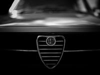 Zwart-wit foto van de grille van een klassieke Alfa Romeo