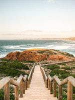 Welkom in de Algarve! Deze prachtige houten loopbrug leidt naar het strand en naar een uitkijkpunt van waaruit je de zonsondergang op Praia da Bordeira kunt zien. De Algarve is de zuidelijke regio van Portugal en staat bekend om prachtige stranden zoals deze.