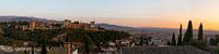 Deze panoramafoto van het Alhambra in Granada is opgebouwd uit ongeveer 12 foto's en is gemaakt vlak voor zonsondergang in september 2017.