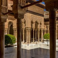 Het uitgebreide complex werd na de verovering van het koninkrijk Granada in 1492 door het katholieke koningspaar als een zeer belangrijke buit gezien. Hun kleinzoon keizer Karel V gaf na zijn bezoek aan Granada in 1526 opdracht tot de bouw van een renaissancistisch paleis midden in het Alhambra, waarvoor een deel van het Alhambra werd afgebroken. Zijn vrouw droeg er zorg voor dat wat nu rest bleef bestaan. Foto: prachtige fijn bewerkte zuilen op de Patio de Los Leones.