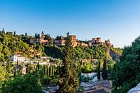 Deze indrukwekkende foto toont het Alhambra majestueus gelegen op zijn heuveltop boven Granada. Het monument straalt trots uit over de stad en biedt tegelijkertijd een glimp van zijn rijke geschiedenis en culturele betekenis. De omliggende natuur voegt extra charme toe aan dit iconische landschap terwijl je kijkt naar hoe dit prachtige gebouw samensmelt met zijn omgeving. Met zijn unieke architectonische details en prachtige tuinen nodigt dit beeld je uit om meer te leren over alles wat dit UNESCO-werelderfgoed te bieden heeft. Deze opname is perfect voor elke liefhebber van geschiedenis of fotografie die gefascineerd is door Spaanse cultuur.