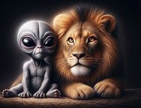 Een ontmoeting uit de ruimte, een alien ontmoet een leeuw en ze lijken goede vriendjes te worden. Unieke vriendschap tussen twee verschillende werelden. Het beeld is met behulp van ai gegenereerd.