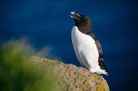 Op deze foto is een zwart witte alk te zien die net zijn snavel een stukje van elkaar doet.