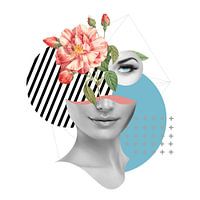 Moderne kunst: collage van diverse afbeeldingen, kleuren en vormen.
