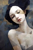 Collage portret van een vrouw in voornamelijk grijs en blauw tinten.