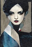 Mixed media portret van een vrouw, collage van verschillende kleuren en texturen op een achtergrond van gekreukeld papier.