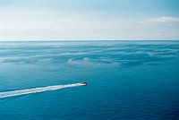 Blauw, blauw en nog eens blauw. Op deze foto zie je de oneindige zee, met een bootje erop. Een fijn zomers beeld waar de kleuren vanaf spatten.