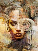 Het maakt duidelijk dat dit werk niet alleen een uiterlijk beeld toont, maar een innerlijke toestand. Het gezicht blijft kalm en geconcentreerd, terwijl de omgeving bijna chaotisch beweegt. Zo ontstaat een contrast: de stilte van de blik tegenover de storm van gedachten eromheen.
