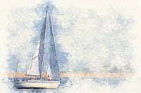Digitaal mixed media kunstwerk, met een combinatie van een illustratie en waterverf, van een zeilboot.