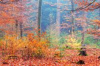 Prachtige opname op een mistige ochtend van een kleurrijk bos met kale bomen, oranje struiken en groene dennen en gele bladeren in het Edese bos bij de Hoge Veluwe in de herfst
