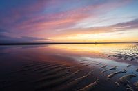 Een kleurrijke lucht wordt weerspiegelt in het achtergebleven zeewater, aan de kustlijn van Westenschouwen. Een vader en dochter zijn nog als laatsten op zoek naar fraaie schelpen.