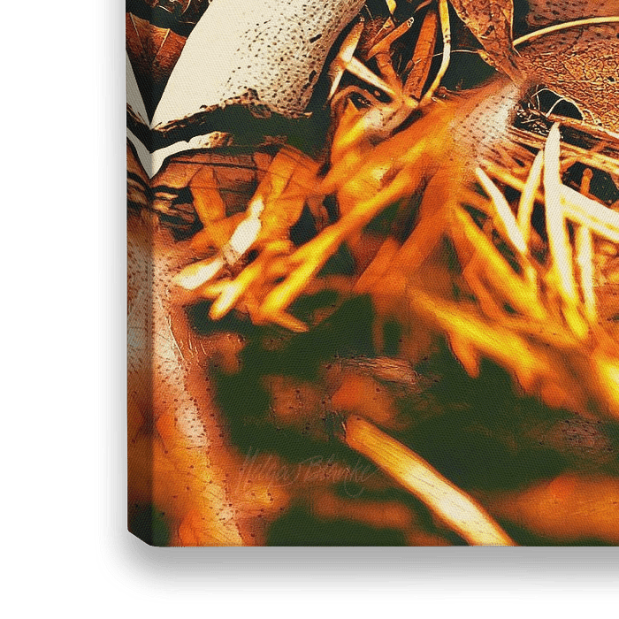 Alleen, in de herfst, is een jonge merel die er wat verloren bijstaat. Geen ouders die voor hem zorgen. Wat er is gebeurt dat wordt eigenlijk niet duidelijk hier, enkel de eenzaamheid van het jonge dier. De herfst is wel volop aanwezig zoals de omgevallen paddenstoelen. De meest opvallende is natuurlijk diegene met de rood met witte stippen, de vliegenzwam, ofwel de Amanita Muscaria. Het gekrulde blaadje doet wellicht dienst als beschutting voor het jonge dier. Ondanks de eenzaamheid van de jonge merel wordt de herfst hier volop gevierd met de warme kleuren van de herfst. Dit werk bestaat in totaal uit 4 foto's, allen gemaakt in de bossen in Helga's woonomgeving. De kleuren van dit herfsttafereel zijn natuurlijk vooral herfstachtig en dus oranje, geel, rood, bruin, crème in verschillende tinten. Een kleurrijk en warm geheel dus dat het mooi doet in elke woonkamer, eetkamer, en natuurlijk ook in de hal en de slaapkamer.
