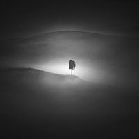 Eenzame boom in de mist en glooiende heuvels lagen in een mistige ochtend bij Volterra. Zwart-wit landschap in Toscane, Italië.