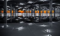 Zwarte BMW in een natte parkeergarage met oranje muur. TL verlichting reflecteerd in het aanwezige water. Foto is gemaakt door Martijn van Dellen // www.martijnvandellen.nl