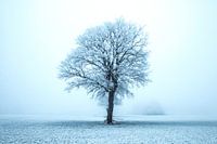 Eenzame boom in de winter, mist en sneeuw. Solitaire boom.