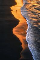 De dronefoto biedt een indrukwekkend vogelperspectief van een eenzame figuur die ontspannen over het strand wandelt. De scène baadt in het warme, gouden licht van de zonsondergang, waardoor het zand in zacht oranje tinten gloeit en het water een glinsterende glans krijgt. De lange schaduwen van de ondergaande zon strekken zich uit over het strand en benadrukken de eenzaamheid van de figuur, die klein en verloren lijkt temidden van dit uitgestrekte landschap. De zachte golven van de zee rollen ritmisch over het strand en laten fijne sporen achter in het zand die snel weer verdwijnen. Deze foto straalt een gevoel van rust en contemplatie uit, gevangen in een vluchtig moment van schemering waar hemel en aarde samensmelten in harmonieuze stilte.