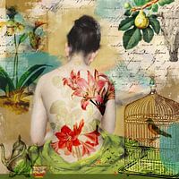 Collage van een vervreemd olieverfschilderij van William Merritt Chase, waarop een Japanse vrouw met een naakte rug te zien is, en diverse historische voorwerpen, dieren en planten.