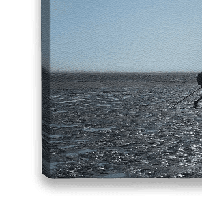 Een silhouette van een wadloper met peilstok alleen op het Wad bij Schiermonnikoog met de zon hoog aan de hemel die als een grote ster met hem mee wandelt!