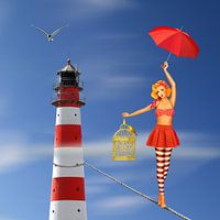 Voor vrijheid die je moed voor nodig. Met pin-up meisje op het touw en vogelkooi in de hand, met vuurtoren op de achtergrond.