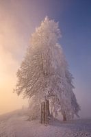In het midden van deze foto staat een enkele boom bedekt met rijp, die met een indrukwekkende aanwezigheid opgaat in het ochtendlandschap. Elke tak lijkt fijn getekend door de vorst, alsof de nacht met een delicate hand een glinsterend patroon heeft achtergelaten. De boom domineert de compositie en trekt de aandacht - majestueus, stil en duidelijk afgetekend.
