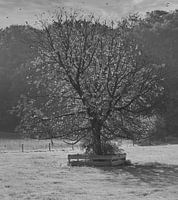 Alleenstaande boom in het zonnetje in het landschap in zwart wit.