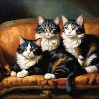 Drie prachtig katten op een mooie empire sofa. Knap en wijs gezeten en geportretteerd. Een schitterend kunstwerkje dat werkelijk in ieder interieur prachtig zal hangen. Tijdloos en uniek.
