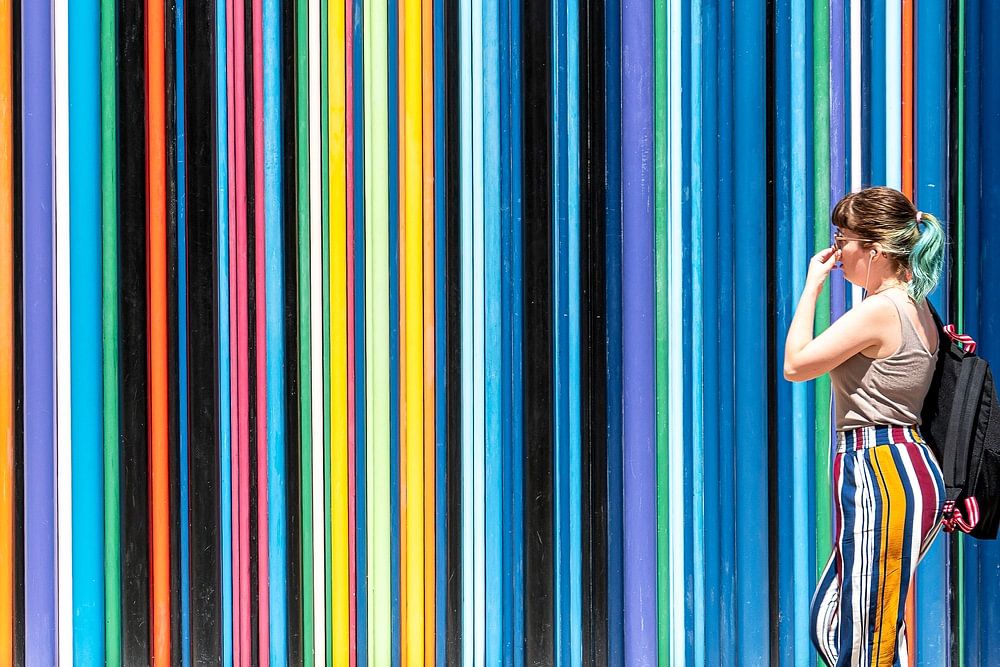 Een vrouw met gestreepte broek loopt voor de Cheminée Moretti, een gebouw in La Defense in Parijs.