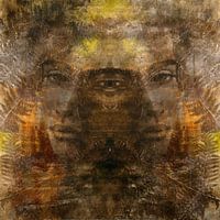 Een mooie jonge vrouw met een dromerige blik. De stemming is mysterieus. De samensmelting van de twee gezichten creëert een indrukwekkend oog.