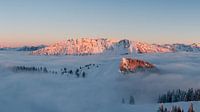 een uniek kleurenspel ontstaat bij zonsondergang tijdens inversieweer met diepe mist in het dal en koude, heldere winterlucht hoog boven de bergen van de Allgäuer Alpen