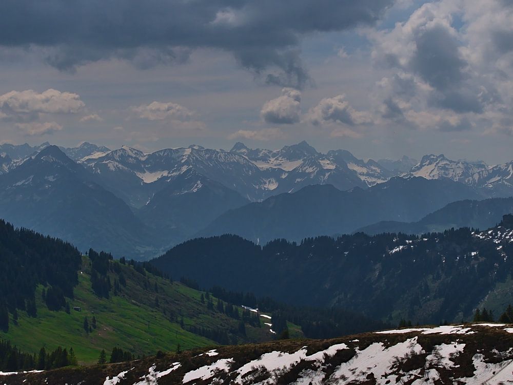 Panoramisch uitzicht over de Allgäuer Alpen bij Oberstdorf, Beieren, Duitsland in de vroege zomer met sneeuwresten op de hellingen en bewolkte hemel gezien vanaf de Großer Ochsenkopf.