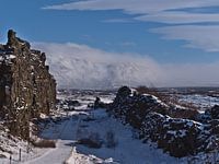 Uitzicht over de Almannagjá-kloof, een kloofdal van de Midden-Atlantische Rug, in Þingvellir Nationaal Park (Thingvellir), deel van de Gouden Cirkel, in het westen van IJsland met ruige kliffen en met sneeuw bedekte bergen op een zonnige dag in de winter.