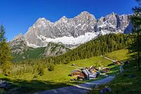 Aan de voet van de steile rotswanden van het Dachsteinmassief in de Oostenrijkse deelstaat Stiermarken, staan een paar almhutten bij elkaar - de Neustadtalmen. Er is aan het einde van de zomer al wat sneeuw gevallen die hogerop de berg is blijven liggen.