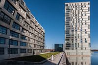 Moderne abstracte flats langs het weerwater te Almere