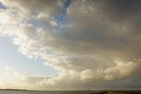 Big skies. Grote wolkenpartijen met buien boven de randmeren van Flevoland. Almere van afstand onder een laaghangende zon