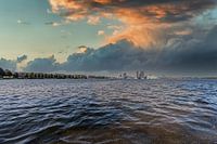 Skyline van de mooie nieuwe stad Almere gezien over het weerwater.