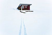 Skisporen in de sneeuw en de Almrausch berghut in de winter in Zürs am Arlberg, Vorarlberg, Oostenrijk