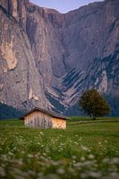 Op deze foto zie je de Monte Sciliar (2461 m) net na zonsondergang. Door het optische effect genaamd 'Alpenglow' lijken de bergen bijna licht te geven. De lucht is bijna niet te zien door de immense verticale muur van deze berg. Op de voorgrond zie je de typische bergweides en hutten voor de Alpe di Siusi (Dolomieten, Italië).