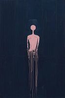 Dit schilderij toont een gestileerd, minimalistisch figuur dat eenzaam lijkt te staan in een diepe, donkere achtergrond. Het silhouet is eenvoudig en bestaat uit een smalle, langgerekte vorm in een lichtroze kleur die scherp contrasteert met de bijna zwarte achtergrond. De textuur van het penseelwerk geeft het figuur een rauwe,…