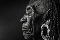Dit opvallende portret legt de diepe rimpels en wijze blik vast van een oudere persoon wiens gezicht een verhaal van levenservaringen vertelt. De details van de huidtextuur en de traditionele oorsieraden benadrukken de culturele diepgang en het erfgoed. Perfect voor verzamelaars van zwart-wit fotografie en liefhebbers van etnische…